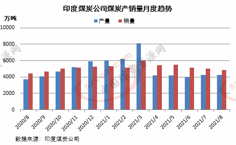 数据显示,8月份,印度煤炭公司煤炭销量为4860万吨,较上年同期的4440万吨增长9.5%,环比下降3.8%。