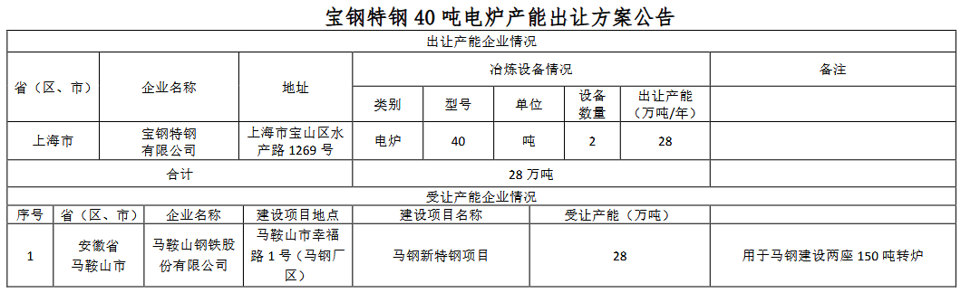 按照《国务院关于化解产能严重过剩矛盾的指导意见》、《国务院关于钢铁行业化解过剩产能实现脱困发展的意见》和《钢铁行业产能置换实施办法》要求,经国务院国资委(国资厅改革〔2021〕240 号)复函同意,拟将宝钢特钢2 座40 吨电炉产能出让。现将宝钢特钢2 座40 吨电炉对应28 万吨炼钢产能出让方案予以公告 ,欢迎社会公众进行监督。