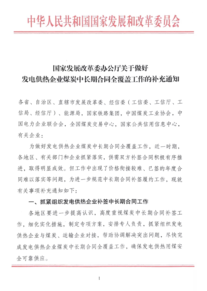 国家发改委关于做好发电供热企业煤炭中长期合同全覆盖工作的补充通知