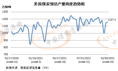 美国能源信息署(EIA)11月4日公布的数据显示,10月第四周(截至10月30日当周),美国煤炭预估产量为1157.4万短吨(1049.98万吨),较前一周增加1.64%,较上年同期增长12.97%。