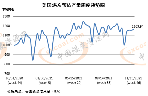 2021年前46周,美国煤炭预估产量共计5.07亿短吨,较上年同期的4.65亿短吨增长9.1%。