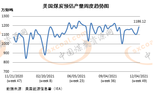 美国能源信息署(EIA)12月9日公布的数据显示,12月第一周(截至12月4日当周),美国煤炭预估产量为1186.12万短吨(1076.03万吨),较前一周增加7.15%,较上年同期增长10.16%,创10周以来高位。