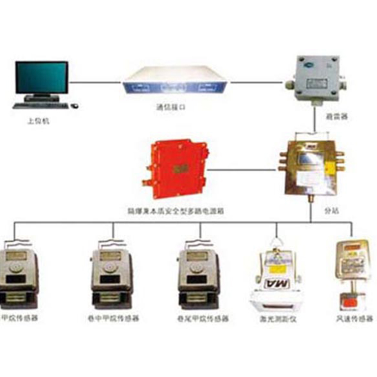 系统可以监测矿井下瓦斯、风速、负压、一氧化碳、温度、风门开关等环境参数,也可以监测并控制井下各种机电设备开停的运行,并将详细的监测数据传送至地面工作主机并随时显示的数据、图形、曲线、报警点 及数值,实现了各局部环节的自动化。