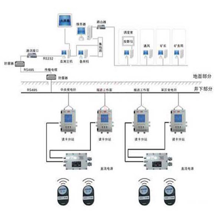 硬件系统:由井下读卡分站、隔爆电源、数据传输接口和标识卡组成,用于完成人员及车辆井下位置信息采集。