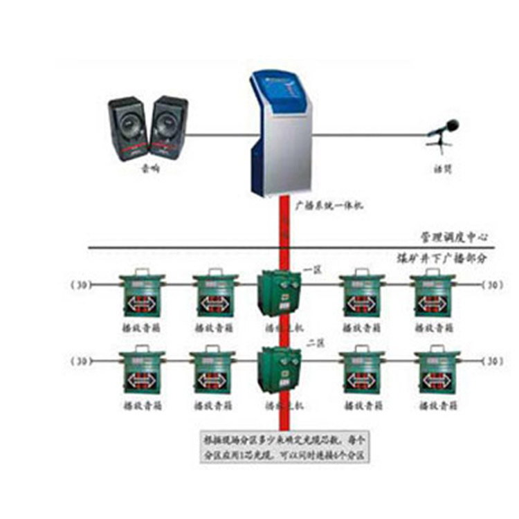 煤矿井下安全应急广播调度系统主要由地面播放设备及井下主、副音箱组成。地面播放设备安装于调度室,井下防爆音箱一般安装于井下大巷、停车场、休息室、采掘工作面等场所,为井下工人提供音乐与安全知识教育以及紧急情况下的安全疏散撤离通知,提高职工的安全生产意识,丰富职工的文化生活。主要是在矿井安全出现紧急情况下,可以在调度指挥中心,通过广播系统向井下覆盖地点下达安全指令,从而有效的指导人员的安全撤离。