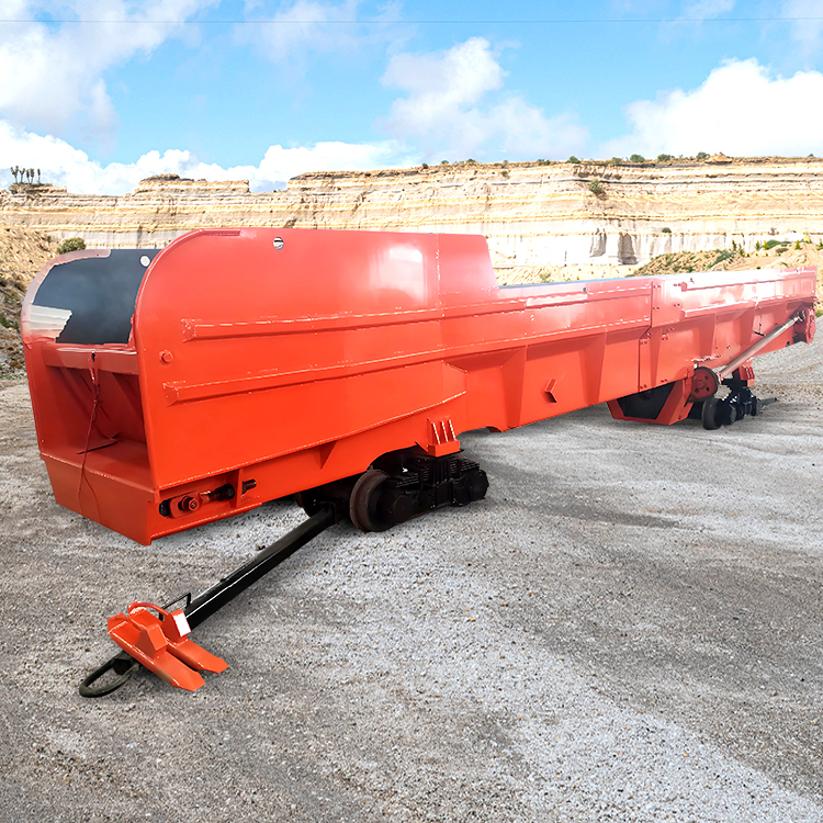 SD系列搭接型梭式矿车车箱内装有刮板运输机,可自动装卸碴石,装卸速度快,效率高。转向架采用钢板弹簧结构型式,减震性能好,运行平稳,不易掉道。 SD系列搭接梭车具有特殊设计,梭车的前一车箱的卸料端能伸入后一车箱的装料端,从而实现在梭车组列使用时的穿套搭接。即能单车使用、又能组列使用。搭接式梭车既能搭接转载,又能搭接运行。梭车由机车牵引至卸碴场,进行自动端卸和侧卸,但后者要求在卸碴处铺岔道车体绕转向架旋转一定的角度,即可实现侧面卸碴。车体分前后两个部分,可拆卸搬运。设计有防爆装置,供用户选用。
