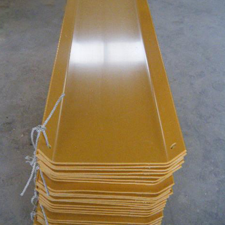 T型、圆弧型的,1.5m长,1m长,8mm厚度,颜色为黄色,表面光滑,四角有椭圆孔作为溜槽连接使用,1.5mT型溜槽重9.8kg,1m弧型溜槽重6kg。