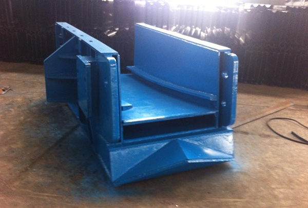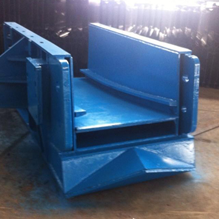 转载机的机头与皮带机自移机尾相搭接。为了有足够的搭接长度和空间,由凹槽把地面的水平段溜槽引向爬坡段,再通过凸槽把爬坡段引向水平架桥段,使溜槽与机头架相联接,形成转载机机头与皮带机机尾相搭接的空间。本转载机爬坡角为10°,使爬坡段煤流通畅。凸槽和凹槽的中板和底板均增加了厚度,并采用大圆弧过渡,减少了磨损,提高了过煤量。在爬坡段与凹槽联接的是铰接槽,以适应巷道底板的起伏不平和皮带机尾移动时引起的高度变化。