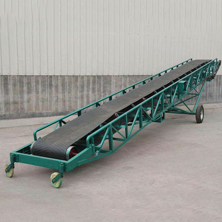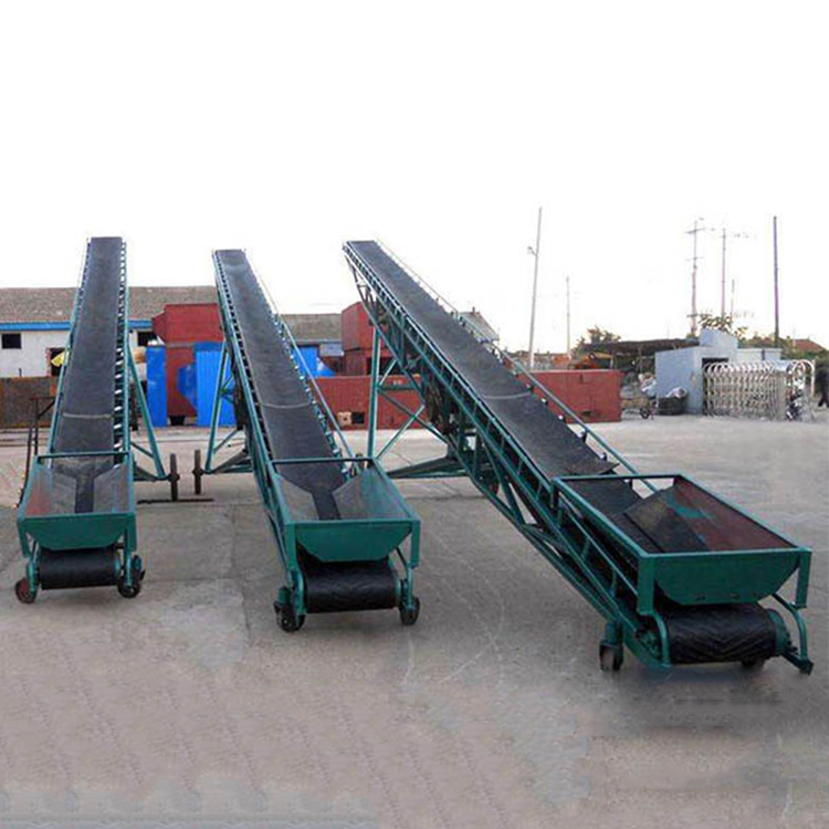 移动式皮带输送机是一种工效高,使用安全可靠,机动性好的连续输送装卸设备。主要用于装卸地点经常变更动的场所,如:港口、码头、车站、煤场、仓库、建筑工地、沙石料场、农场等,用来短途运输及装卸散料或单件重量100公斤以下的成件物品。移动式皮带输送机分为可升降型及不可升降型两大类,输送带的运行靠电动滚筒驱动,整机的升降与运行均为非机动。 移动式皮带输送机适用于散状物料或成件物品的短途运输和装卸工作。采用钢管结构,轻巧美观,机动性好。转动装置为电动滚筒,并配有充气轮胎和钢轮两种行走轮。机长10米以上倾角可调。