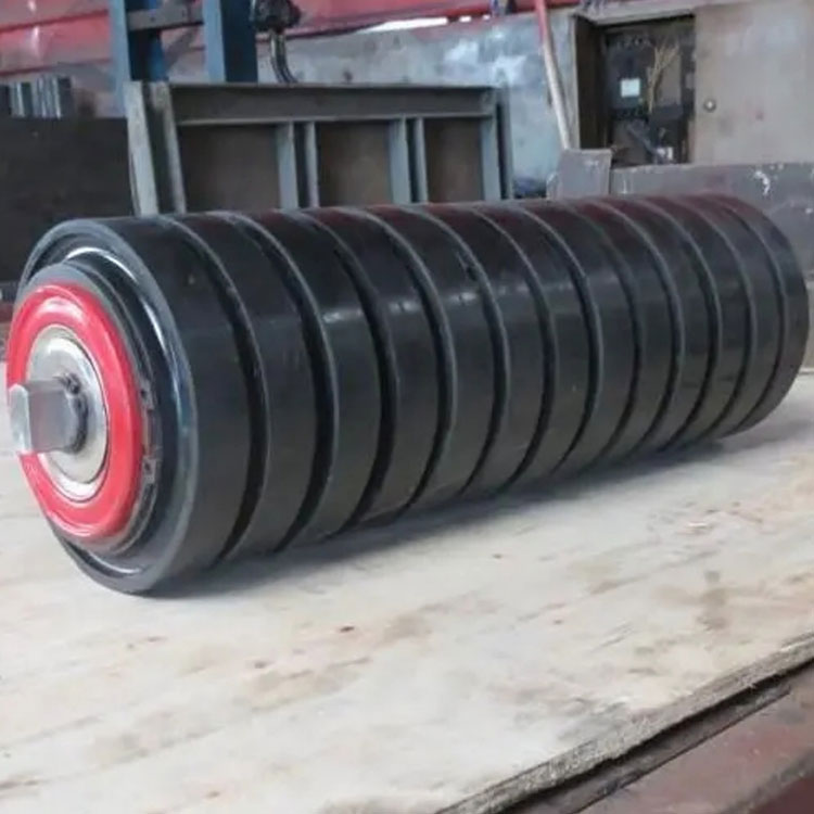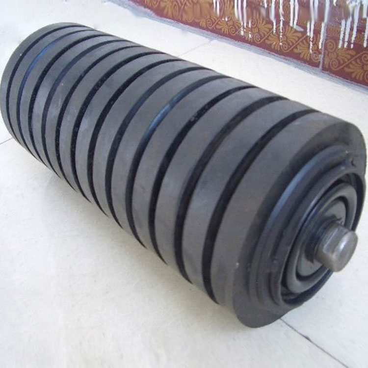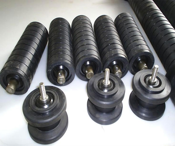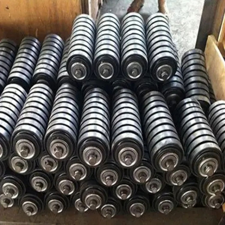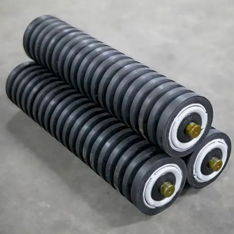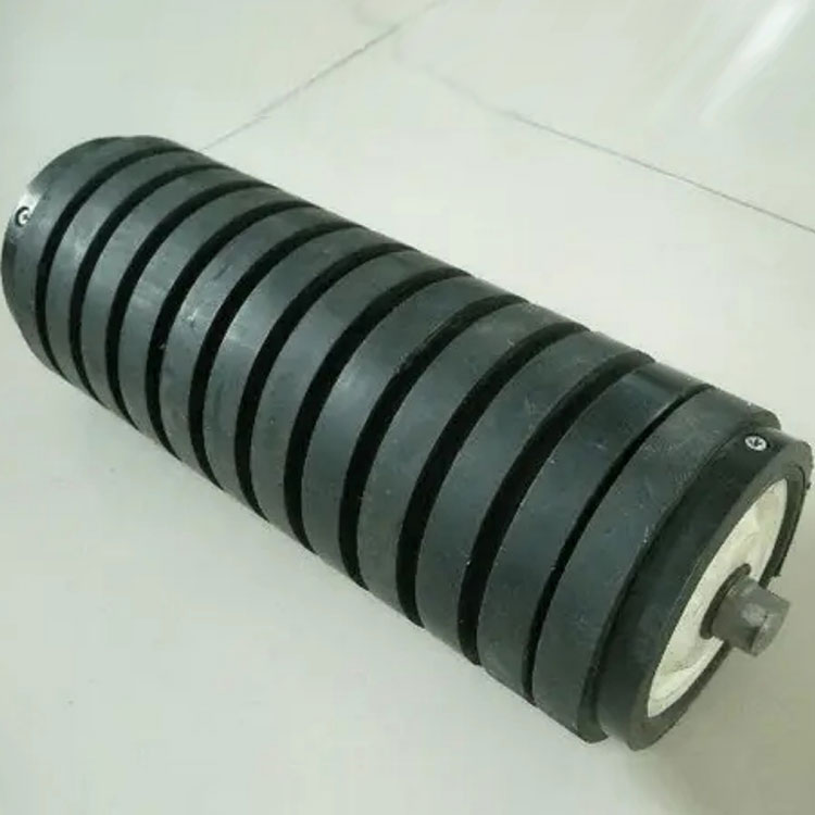 橡胶缓冲托辊表面由冷钻接连体弹性胶环和锁环构成,缓冲托辊安装在输送机受料段的下方,减少输送带所受的冲击,延长输送带使用寿命。缓冲托辊主要起缓冲作用。