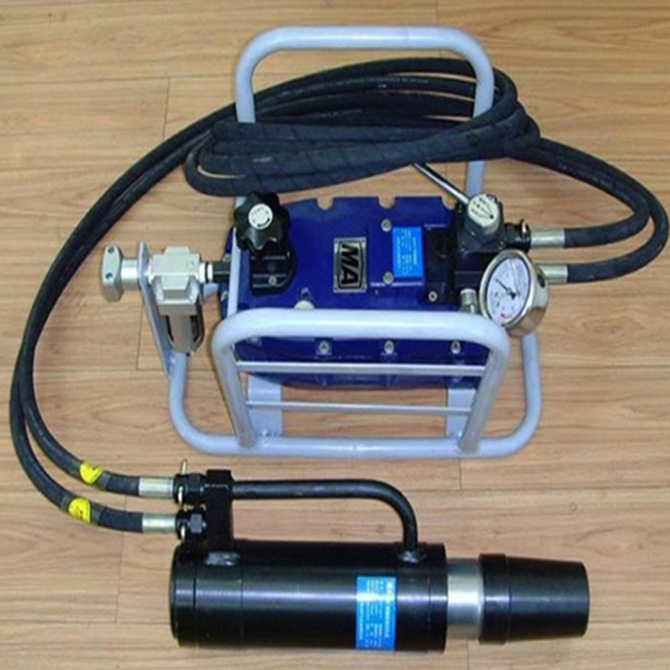 锚索张拉机具由预应力张拉千斤顶、带单向阀的快速接头、高压油管、手动油泵(气动油泵,电动油泵)等组成,主要用于煤矿巷道锚索支护时张拉锚索并安装锚具,也可用于桥梁、隧道、高速公路等张拉预应力钢绞线。