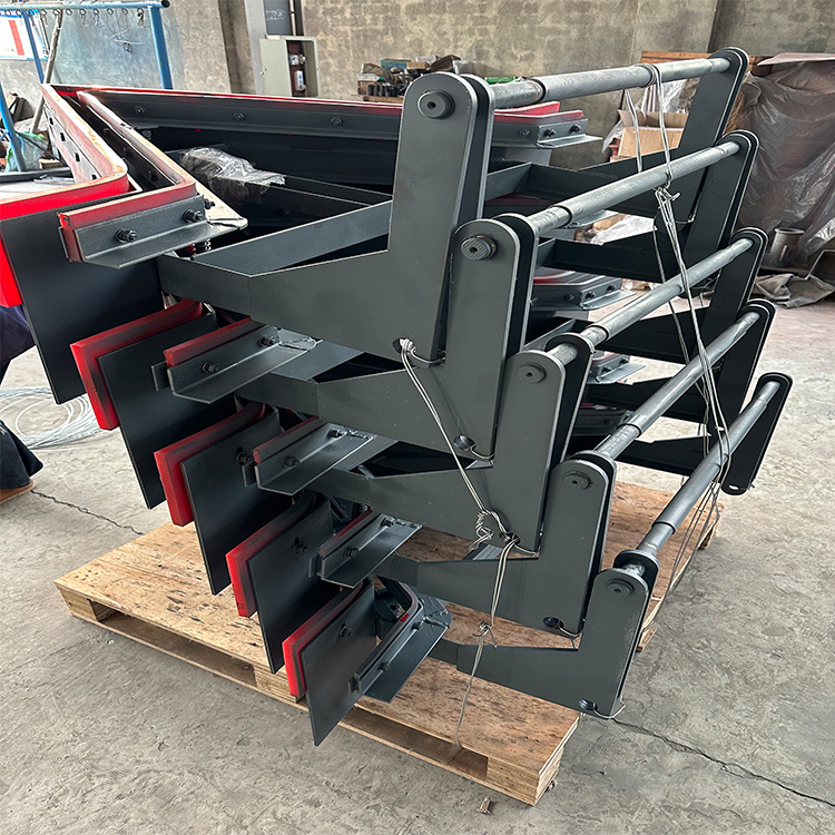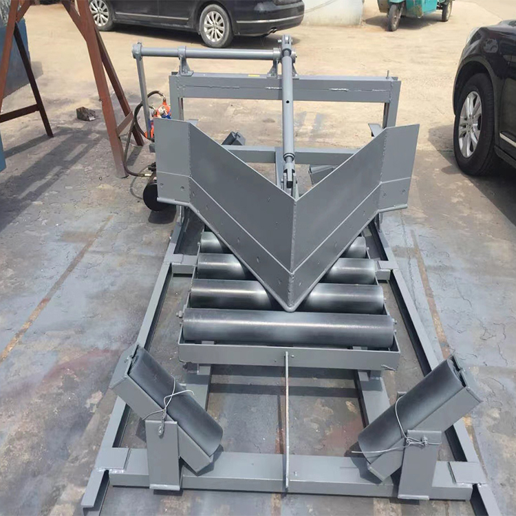 电动可变槽角犁式卸料器是安装在胶带输送机的中间架上,能将胶带输送的物料均匀、连续卸入料斗或需要场所的皮带输料辅机。本卸料器比老式卸料器增加了可变槽角、副犁刀等,并改用电液推杆动力源。克服了老式卸料器犁料不尽、刮皮带以及电动推杆过载能力差,常烧毁电机,顶弯丝杠,机械易损坏等缺点。