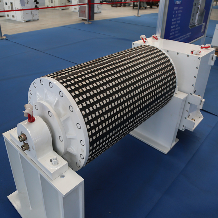 矿用隔爆兼本安型永磁同步变频调速一体式电动滚筒是以低速大转矩外转子永磁同步电机为核心的一种新型驱动设备,电机转子即为驱动系统滚筒,变频器与滚筒集成一体,效率更高、结构更加简单紧凑,且运行平稳,维护成本低。