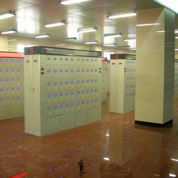 充电架主体1.2mm厚冷扎钢板,四层挂灯,每层26个独立工位,架体机械尺寸:长×高×深 =2155*560*1900mm,单个柜体尺寸约18**20*18,可同时将自救器和矿灯置于带锁的挂架上,方便灯房超市方式管理,减少灯房人员数量和工作强度。