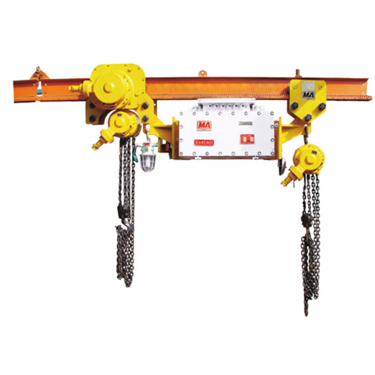 该机结构由起吊装置、行走机构、轨道、吊挂组件、电缆拖曳装置、电控系统等组成。出厂整机长度为99米,每节轨道长度为3米,扣式连接。轨道由工字钢及齿条组成,行走机构由电机、减速箱等部分组成,减速箱的输出行走齿轮与齿条啮合。起吊装置安装在行走机构下方。整机靠吊挂组件与十字梁或锚杆连接,通过锚杆或十字梁固定在巷道的顶板上。