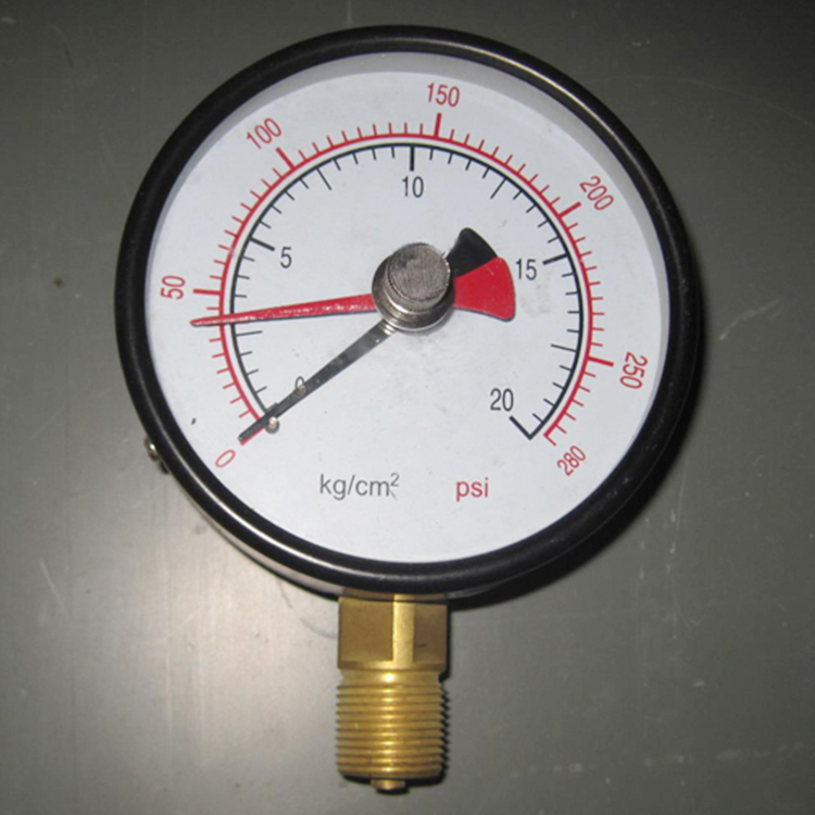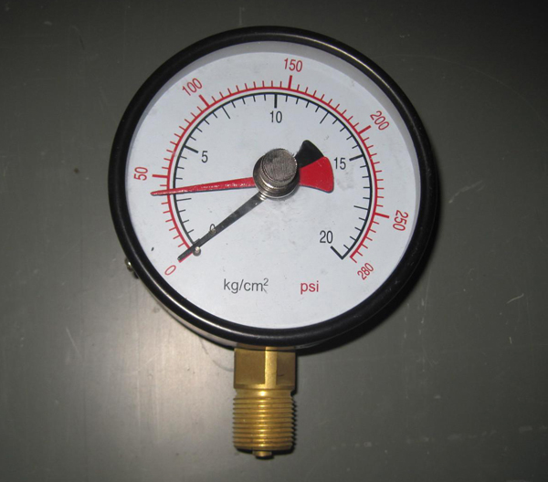 1、在使用前,先用手将付针(红针)回零,然后再进行压力测试,其中主针(黑针)显示当前压力,付针显示测试过程中 大压力。