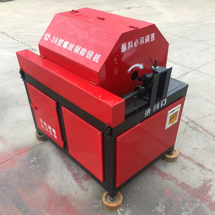 首先确定要除锈的线材直径,预选一条直径比其他小2-4mm的光圆直线材料作为基准钢筋(如:除锈钢筋为25mm,校正钢筋就用22mm)对进料口、两个除锈装置钢丝调整部分和出料口进行校正。