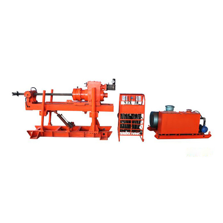 电动机驱动油泵,将两股液压油经操作台,一股压力油输送到与减速机连接的液压马达,减速后输出动力,带动钻具回转。另一股压力油输送到油缸推动活塞来回移动,即可带动动力头作给进,回程或起拨钻具。顺逆时针旋转节流伐手轮可调节钻机钻孔给进速度。操作相应手柄可控制液压夹持器、液压卡盘动作,松卸,夹紧钻杆以及机架升降和钻孔或安装角度的调整。