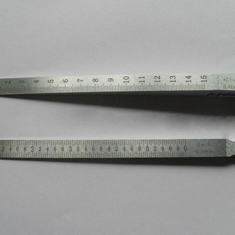 楔型塞尺(斜度规)(孔尺)适用于现场测量深度间隙或深度孔径、内径。例:电力、铁路、建筑、桥梁、运输、焊接、公路、造船、汽轮机、水轮机、大型水泵、陶瓷卫具、汽车、模具、油嘴、喷嘴等行业。间隙尺(孔径规)(喉部塞尺、喷嘴塞尺)特点及使用方法:孔尺适用于现场测量深度间隙、孔径、内径。用途广泛,结构简单合理、测量方便、快捷。省时、省力,提高工作效率。测量时将尺置于被测间隙或孔径内即可得出测量结果。