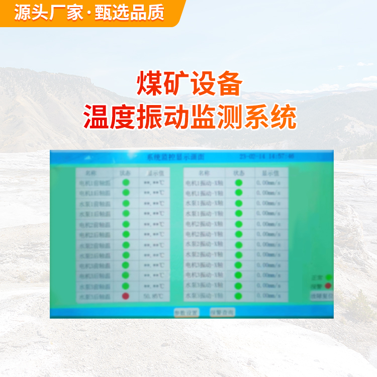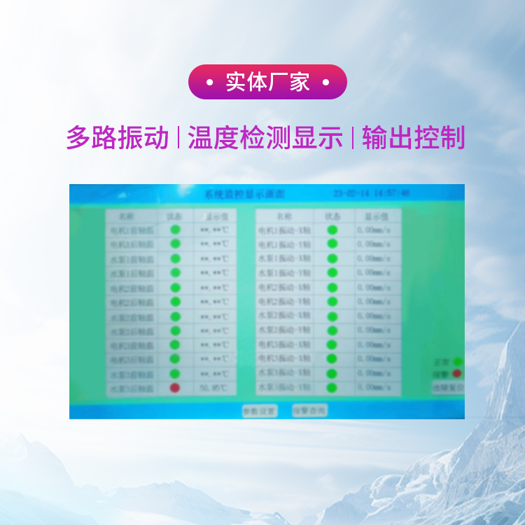 温度振动监测系统用于对煤矿井下电机、水泵等电器设备的振动、温度进行长期监测;监测装置主机采用品牌PLC,触摸彩色显示屏,具有多路振动、温度检测显示、以太网通讯,声光报警,输出控制等功能。
