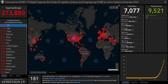 据美国约翰斯·霍普金斯大学发布的实时统计数据显示,截至北京时间4月4日06时30分左右,全球新冠肺炎确诊病例已超过100万例,共计1094068例。其中美国累计确诊273880例;死亡病例7077例;康复人数9521人。与前一天6时30分数据相比,美国新增确诊病例35060例,连续第5天新增确诊数超2万;死亡病例新增1319例。