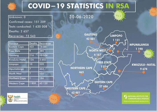 6月30日南非卫生部确认南非当天新增新冠肺炎患者6945人,新冠肺炎患者总人数达到151209人,南非全国已检测1630008人,当日检测33013人。