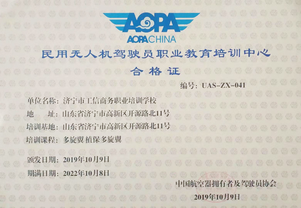 近日,经中国民航局AOPA协会严格审定,正式向中煤集团旗下济宁市工信商务职业培训学校核发了民用无人机驾驶员职业教育培训中心合格证书,该校正式成为AOPA-China授权的无人机驾驶及行业应用技术培训单位,这也是济宁市首家取得民用无人机驾驶员培训资质的职业培训学校。
