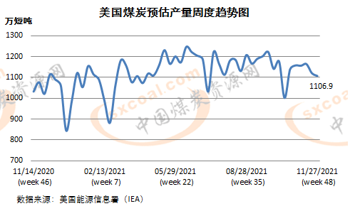 2021年前48周,美国煤炭预估产量共计5.3亿短吨,较上年同期的4.86亿短吨增长8.95%。