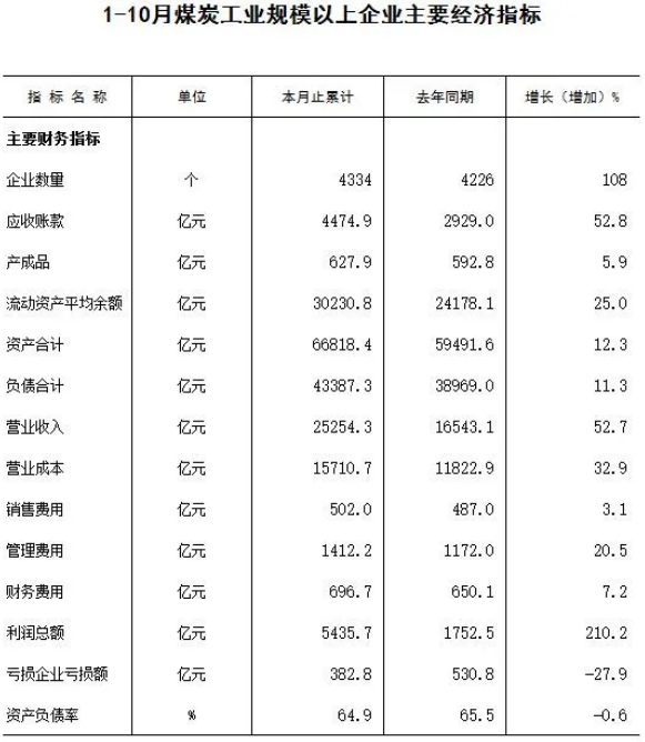 指标显示,1-10月份,4334家规模以上煤炭企业营业收入25254.3亿元,同比增长52.7%;营业成本15710.7亿元,同比增长32.9%;应收账款4474.9亿元,同比增长52.8%;利润总额5435.7亿元,同比增长210.2%。