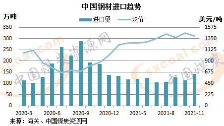 1-11月份中国钢材进口额为171.8亿美元,同比增长11.4%。据此测算,1-11月中国钢材进口均价为1294.8美元/吨,同比增长58.3%。