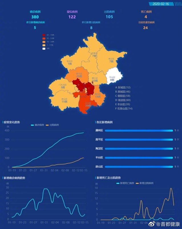 截至2月15日24时,本市累计确诊病例380例。其中出院105例,死亡4例。东城区12例、西城区46例、朝阳区58例、海淀区60例、丰台区39例、石景山区14例、门头沟区3例、房山区15例、通州区18例、顺义区10例、昌平区25例、大兴区39例、怀柔区7例、密云区7例、延庆区1例,外地来京人员26例。平谷区尚未有病例。
