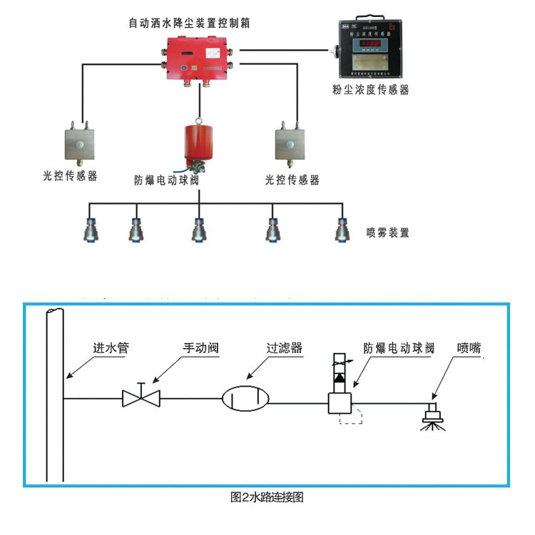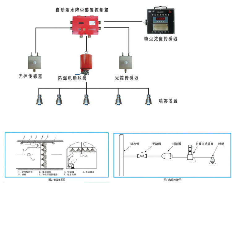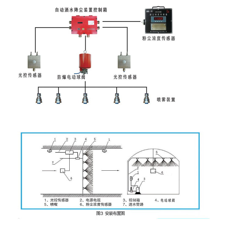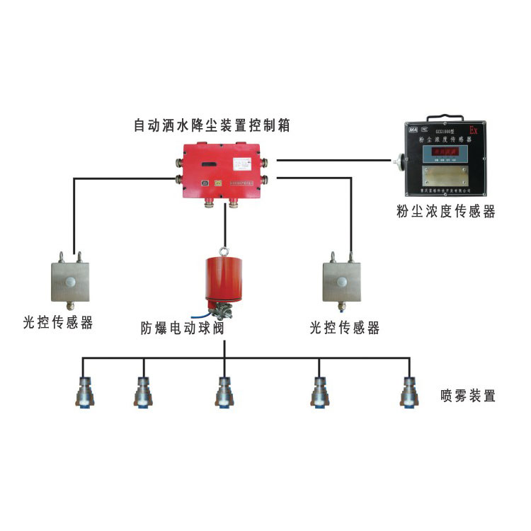 装置由KX JPA-127S型矿用自动洒水降尘装置控制箱、ZP-12.5G型矿用自动洒水降尘装置用光控传感器、DFB 20/10.0矿用隔爆型电动球阀等部分组成。