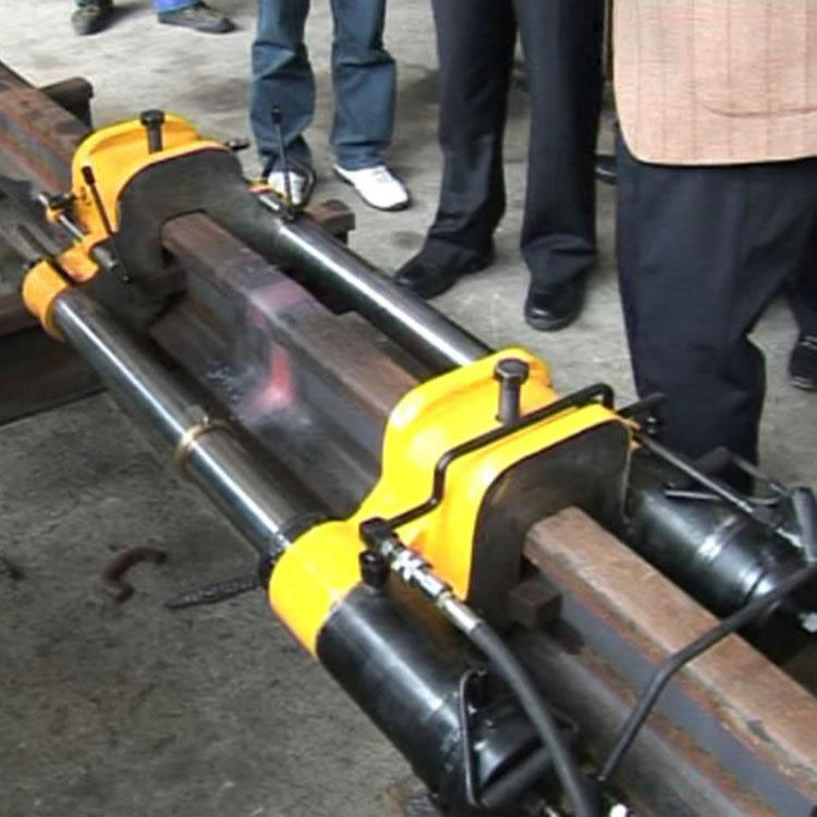 1、先调平两根待焊钢轨,将压接机骑放在待焊钢轨上,让焊缝位于距离带油缸机座195mm~205mm处,拧紧轨底及轨顶螺栓,插入斜铁。