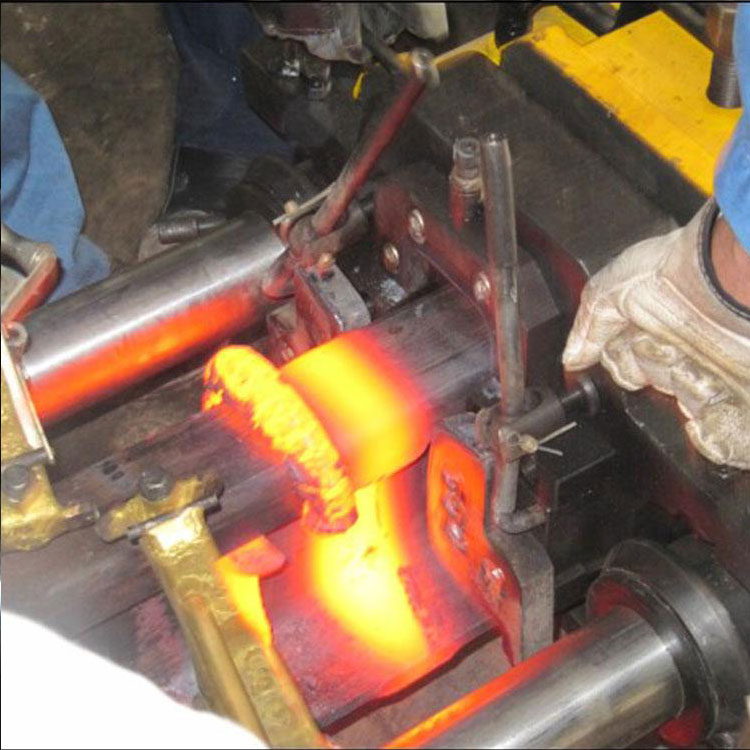 6、摆动加热器以使其对钢轨焊缝均匀加热,摆动量控制在焊缝左、右5mm左右,待钢轨加热至出现微凸时(时间约3.5分)泵站降压至7Mpa左右保持,继续加热至塑化状态(轨底角已出现即将熔化状态,加热温度到1350℃~1400℃时),立即加压顶锻(共5.5分左右),顶锻量达32mm左右,停止顶锻(即在4.5分到5分左右上推凸刀装置,并用压接机上的锁紧扳把锁紧,安装好腰刀、底刀),此时迅速扳动压接机上的换向阀至推凸位置(同时将加热器熄火,将控制箱上的氧气和乙炔快关阀同时关闭),推凸油缸伸出,观察已全部推除完毕可停止供油,反向给油让推刀退回,一旦卡住应停止,可将底刀取下,拔出腰刀再退回原位,取下推凸机,并取下加热器。