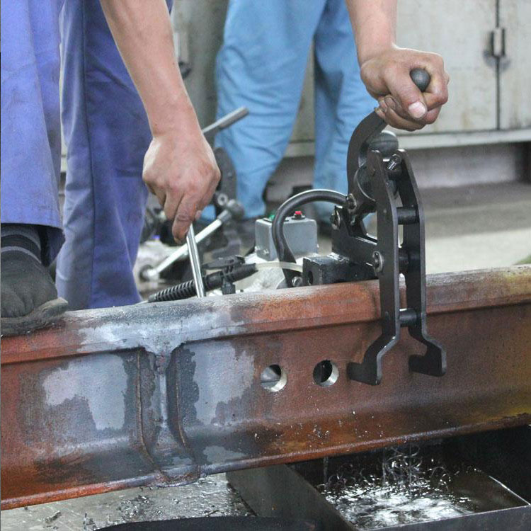 5、抬起卡紧搬把5,使卡轨机构张开,放在钢轨上,调整卡轨机构调整螺母6,直至下压卡紧搬把时能牢固卡紧钢轨(一般情况下,夹具体7下部两尖部卡在大约钢轨轨腰部位),松开后下道自如,钢轨待钻孔的中心与钻头中心一致(采用定位尺钻孔,详见9),并且前板与钢轨底面目视垂直,定位块与钢轨轨腭及轨底上弧面紧密接触,然后下压卡紧搬把6,装卡牢固后便可进行钻孔作业。